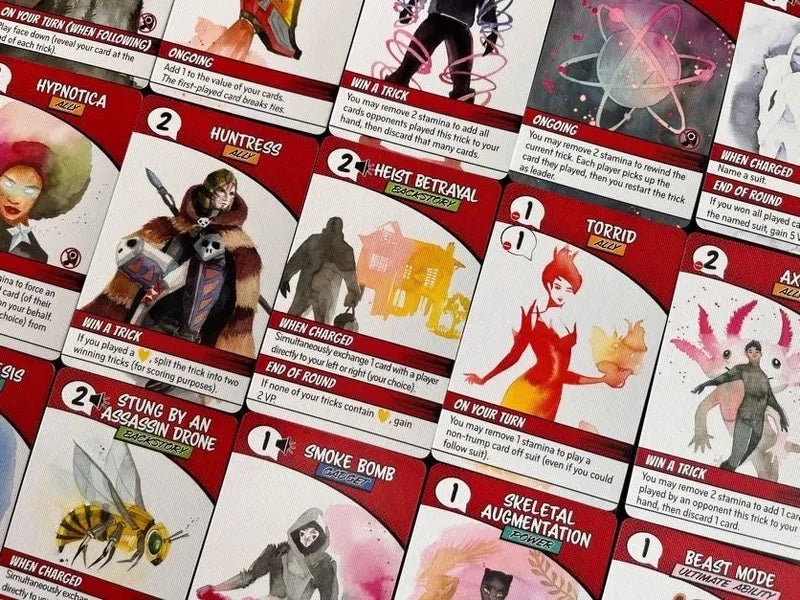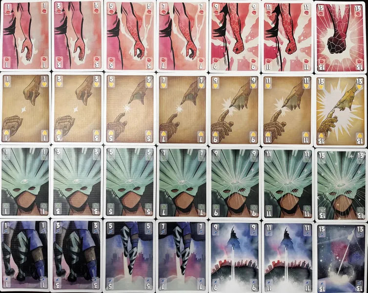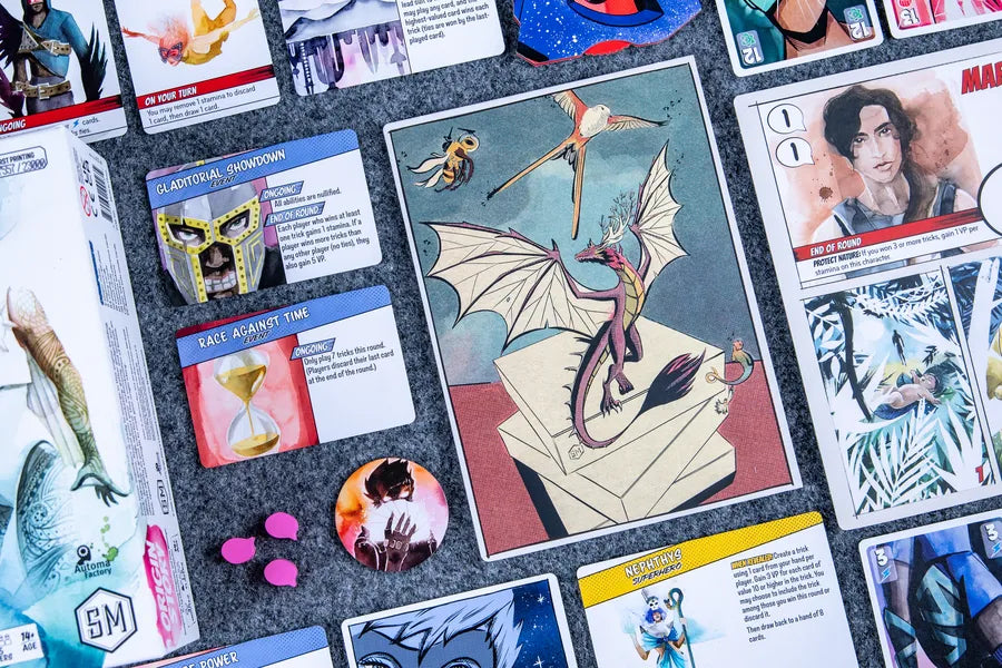 Origin Story is a 1-5 player competitive tableau-building, trick-taking game played over 5 rounds. Each round represents a chapter in your development and grants a new card to add to your player mat. Charge your cards and use their abilities to score more points than your opponents.