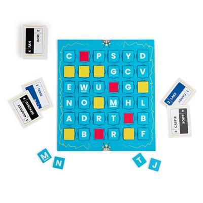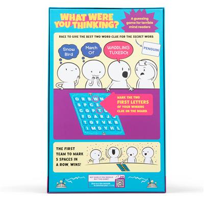 Race to give the best two word clue for the secret word. So if your word was “Penguin” you might give clues like “Snow Bird” or “Waddling Tuxedo.” If your clue gets someone to guess the word, mark the first two letters of that clue on the Board (if “Waddling Tuxedo” won, mark “W” and “T.”) The first to mark 5 spaces in a row wins!
