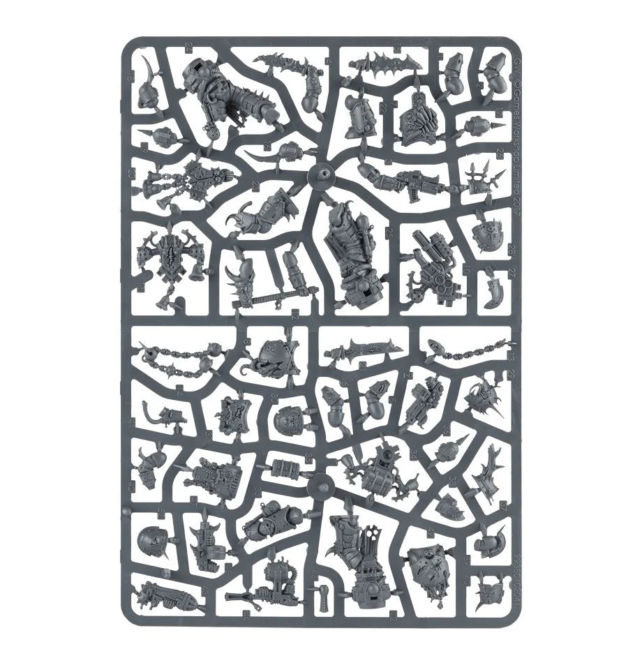 These models feature a wide range of weapons and heads, many of which are designed to fit a specific model – there are 8 boltguns, 4 plague knives, 2 bubotic axes, a blight launcher, a plasma gun, a meltagun, a plaguebelcher, a heavy plaguespewer (with backpack), a mace of contagion, a great plague cleaver, a plague flail, a plasma pistol and a bolt pistol. There are 2 weapon options available for the unit Champion: a specific plaguesword and power fist, and there are a total of 16 bare and helmeted heads. 2 specific arms are included for a model holding a blight grenade, with one hand pulling the pin.