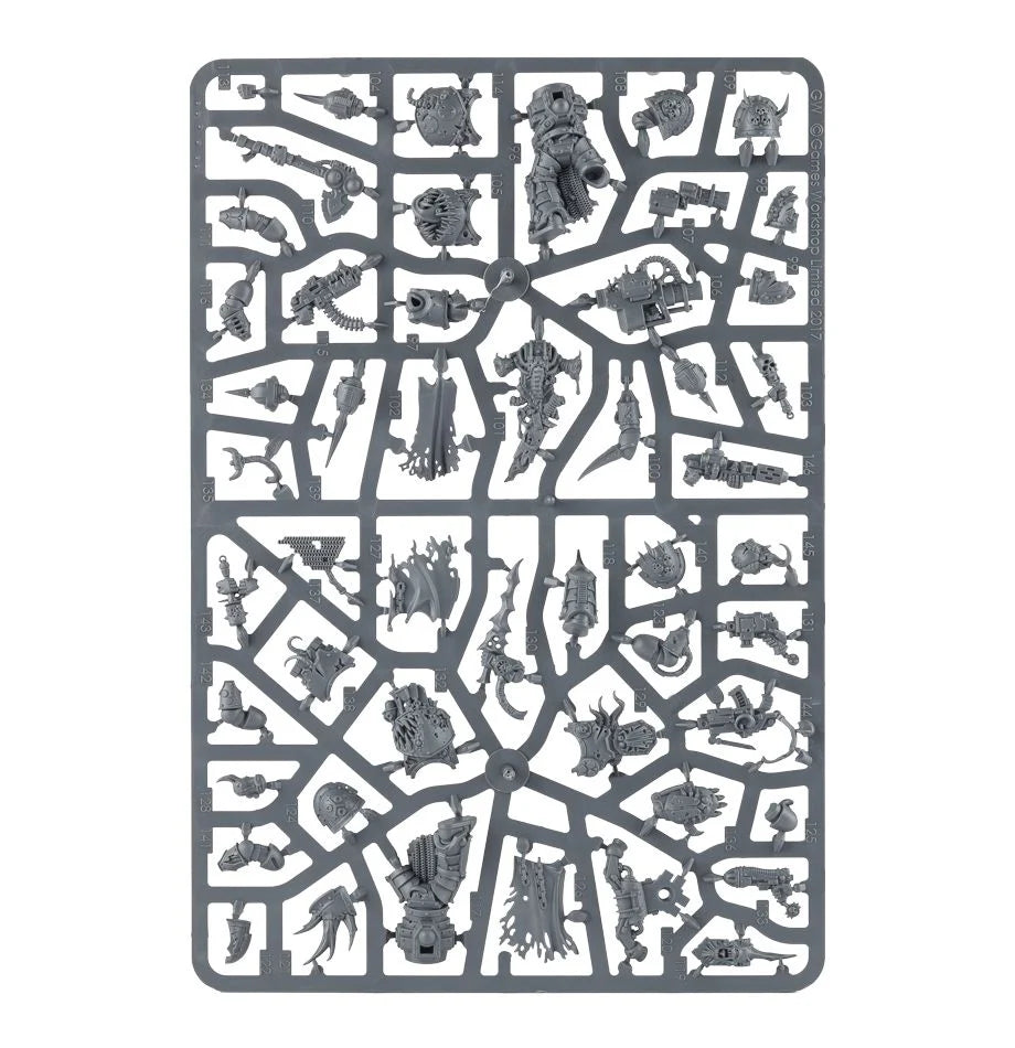 This multi-part plastic kit contains the components necessary to assemble a 7-man squad of Plague Marines. Each is posed dynamically, with the usual Death Guard accoutrements – cracked, rotting armour revealing grasping tentacles, severed heads displayed proudly on belts, backpacks sloshing with unnatural diseases and pipework leading from rebreathers to Nurgle knows what foul concoctions. There’s an Icon of Despair included, so your unit can feature an icon bearer.